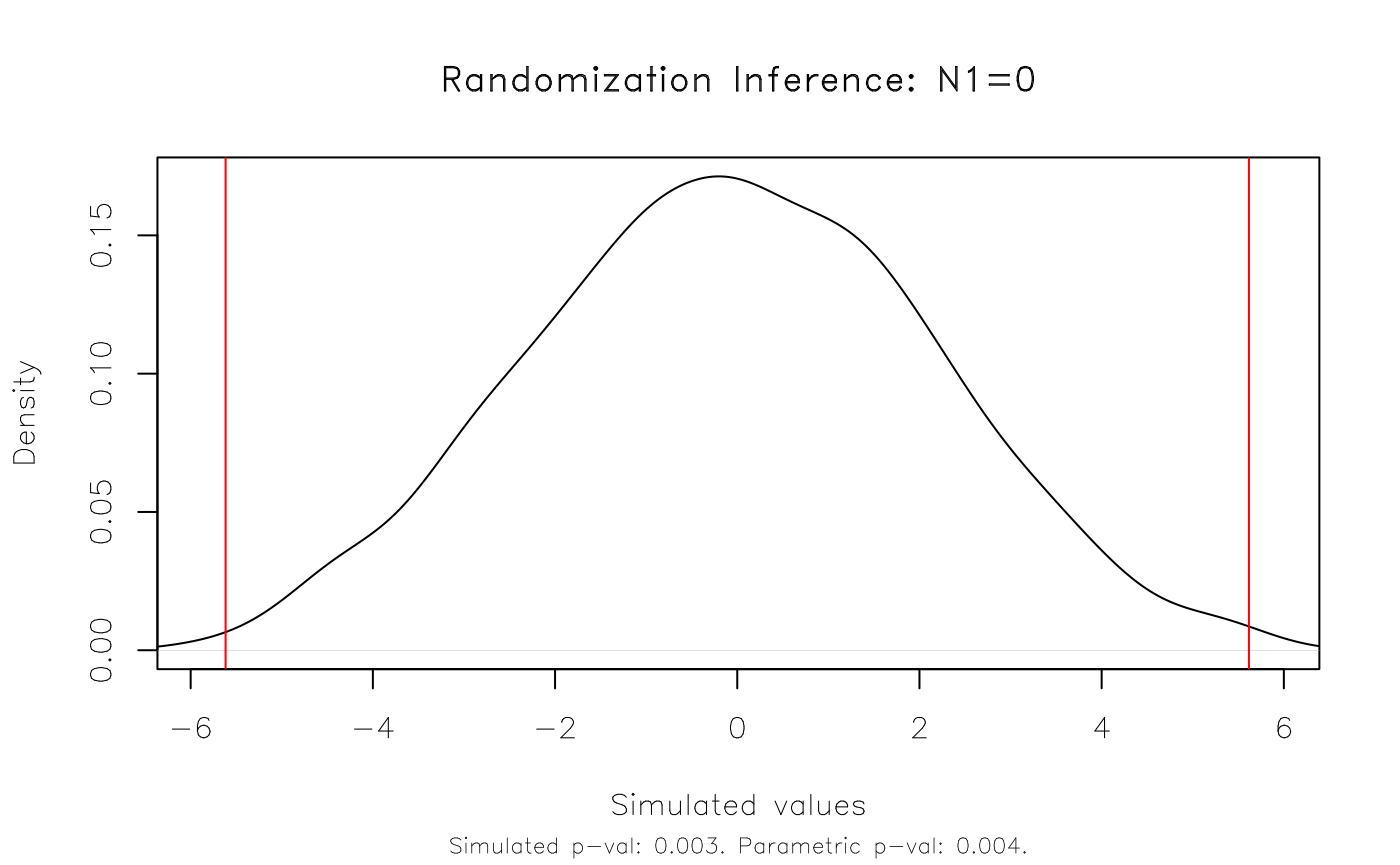 #> Note: c = #{|T| >= |T(obs)|}In this simple case, our parametric results appear to hold up very well. The original p-value of 0.019 is very close to the equivalent rejection rate of 0.021 that we get with our RI procedure.