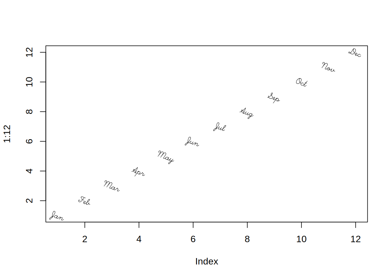 # for advanced customization, it's safer to pass args through `type_text()`tinyplot(1:12, type =type_text(labels = month.abb, family ="HersheyScript", srt =-20))