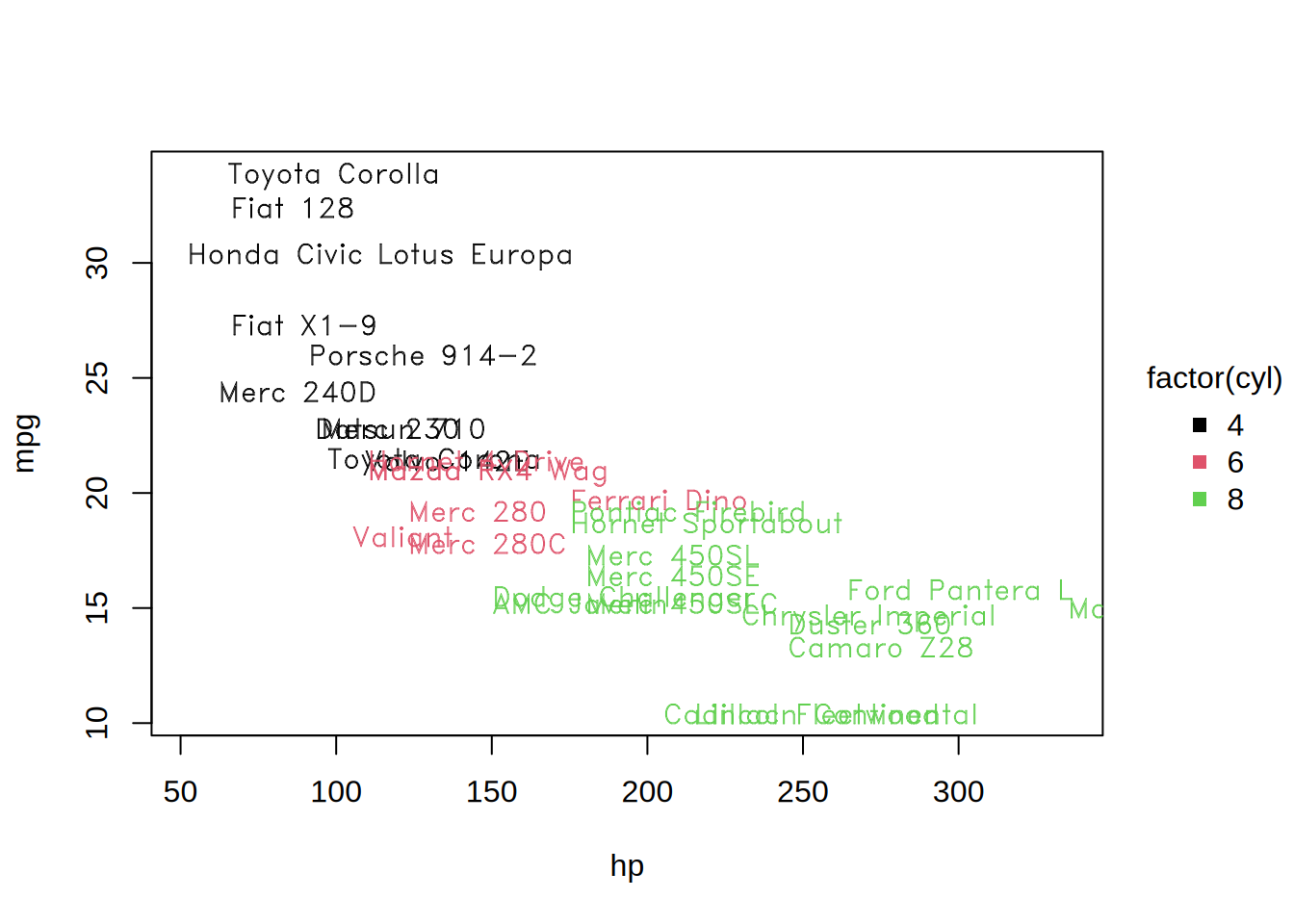 # tip: use `xpd = NA` to avoid clipping text at the plot regiontinyplot(mpg ~ hp |factor(cyl),data = mtcars,type =type_text(labels =row.names(mtcars),family ="HersheySans",font =2,adj =0,xpd =NA ))